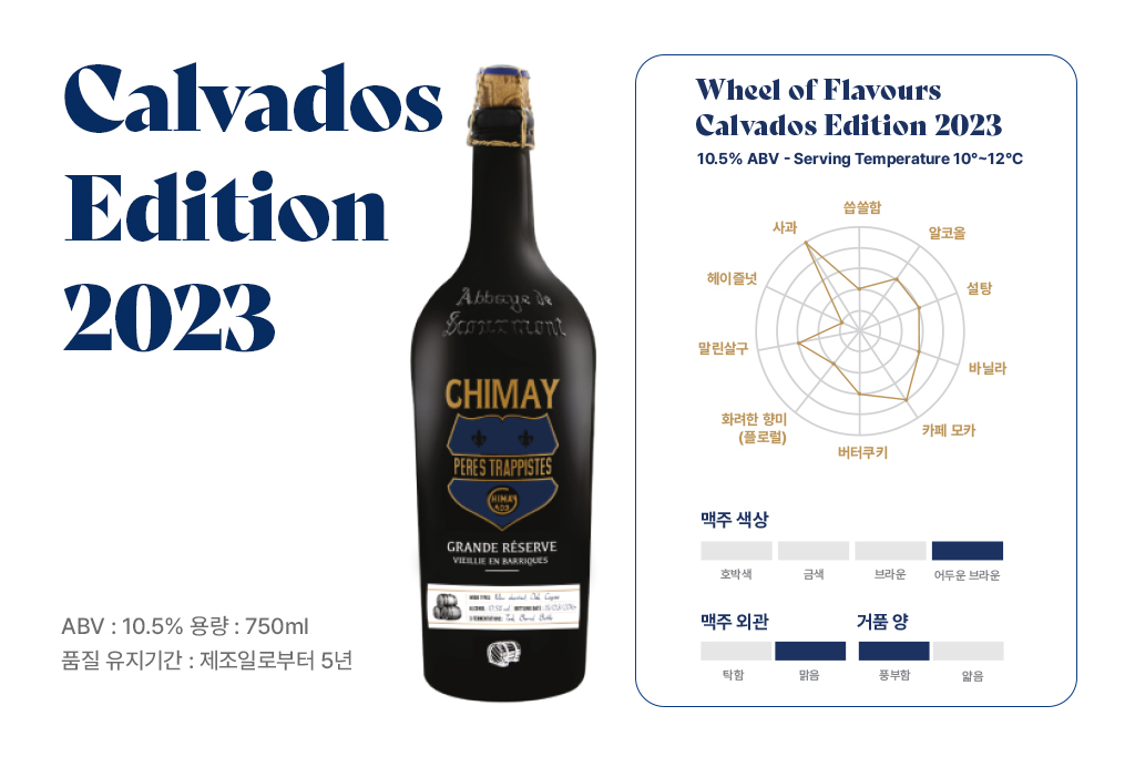 2023년 배럴 에디션은 칼바도스 배럴을 사용하였습니다. 칼바도스는 프랑스 노르망디 지역에서 사과 또는 유러피안 배로 만든 브랜디(사과주)입니다. 이 에디션은 특히 과일 향이 두드러지고 칼바도스 특유의 건살구, 달콤한 사과, 잘 익은 유러피안 배의 향이 맛있는 초콜릿과 부드러운 카페 모카의 풍미와 아름답게 어우러집니다. 이 다채로운 맛은 구운 해이즐넛과 스파이시 비스킷의 완벽하게 균형 잡힌 맛으로 이어지며, 그 위 약간의 바닐라와 가벼운 꽃 향기가 더해집니다.