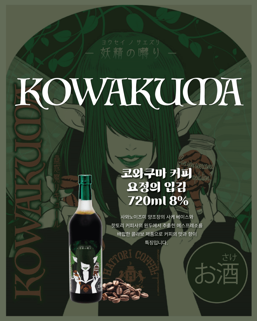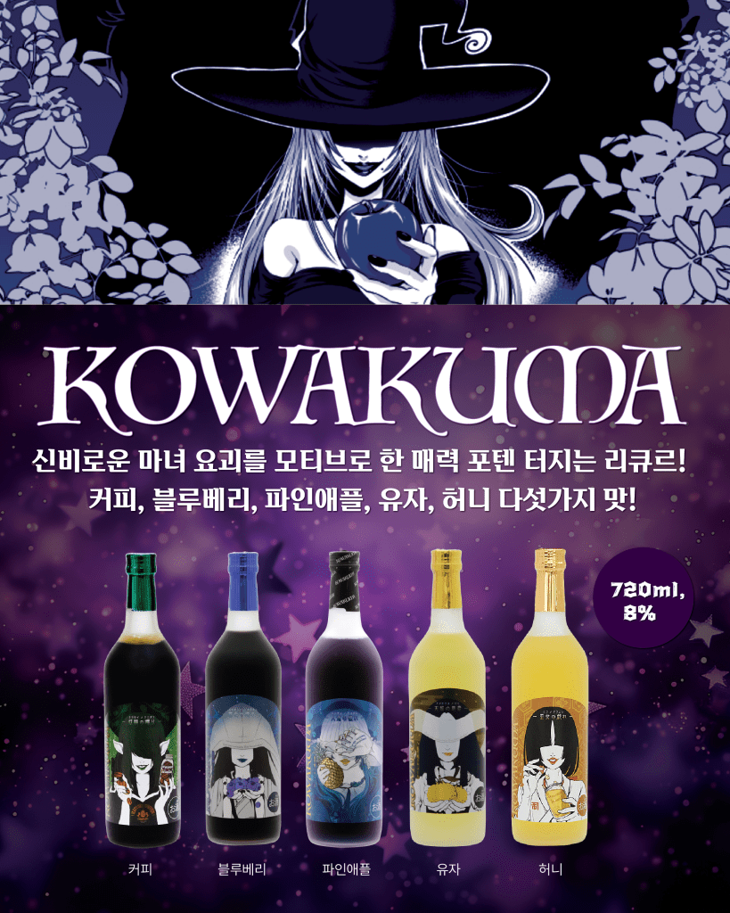 신비로운 마녀 그리고 요괴를 모티브로 한 매련 포텐 터지는 리큐르! 다양한 맛으로 재미있게 즐기기 안성맞춤! 코와쿠마가 출시되었습니다. 현재 이마트와 현대 백화점에서 소량 판매하고 있어요~ 그리고 GS 스마트 오더 앱에서도 다음 다섯 가지 맛을 구매하실 수 있습니다: 커피, 블루베리, 파인애플, 유자, 허니. 일본 현지에서는 특히 커피 맛을 가장 추천한다고 합니다!