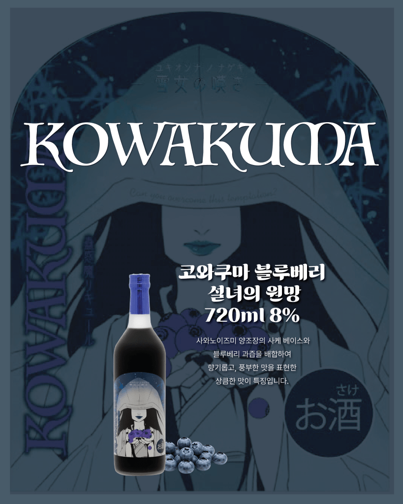 일본 요괴 ‘설녀(雪女)’를 모티브로 한 *“설녀의 원망”은, 코와쿠마 블루베리의 향긋한 향과 은은한 달콤함이 어우러진 특별한 맛을 선사합니다. 코와쿠마 블루베리는 스트레이트, 온더락, 밀크와리(우유와 1:1 비율) 등 다양한 스타일로 즐기실 수 있습니다.