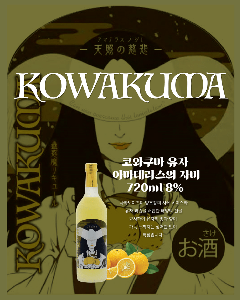 할로윈데이와 잘 어울리는 코와쿠마 5종을 소개드립니다. 준마이 사케를 베이스로 만들어 부드럽게 데일리로 마시기 좋은 리큐르입니다. 커피, 블루베리, 파인애플, 유자, 허니 이렇게 총 다섯가지의 맛으로 각 맛 마다 요정, 일본 요괴 등을 모티브로 스토리를 담았습니다. 매력적인 라벨 디자인으로 특별한 날 또는 선물로도 좋습니다.