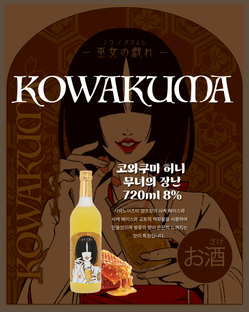 무녀의 장난이라는 스토리를 담은 코와쿠마 허니는 일본의 무녀 ‘미코’를 모티브로 만든 매우 전형적인 일본의 맛을 느낄 수 있는 상품 입니다. 교토의 백화꿀을 사용하여 꿀의 달콤함과 벚꽃의 향이 은은하게 느껴지는 맛이 특징입니다. 스트레이트・온더락・오유와리(코와쿠마허니1:1따뜻한물)
